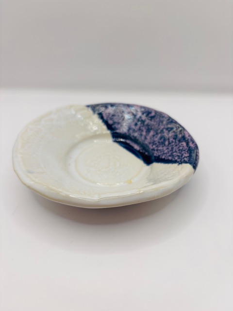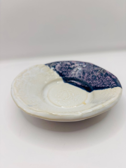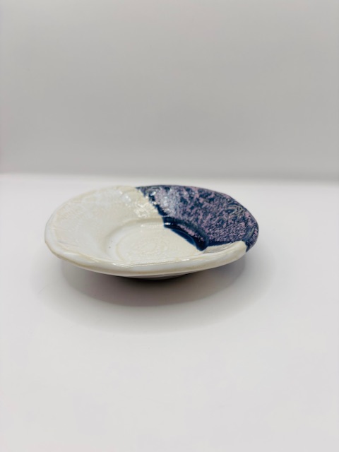 Coloris blanc et lilas, motif dentelle.