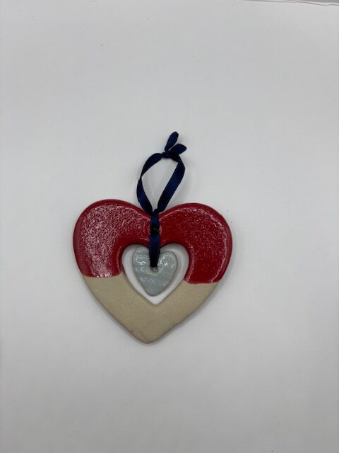 Grès émaillé. Coloris rouge/beige et gris bleuté. La partie inférieure est en terre brute non émaillée.