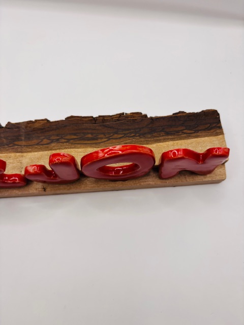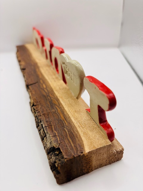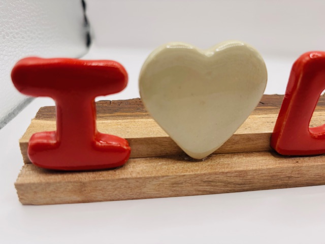 Lettres et coeur en céramique émaillée. Coloris rouge et blanc.