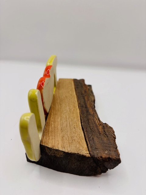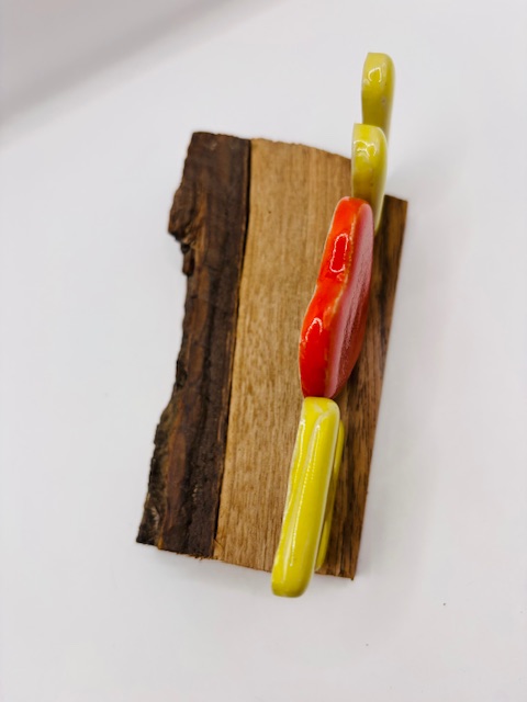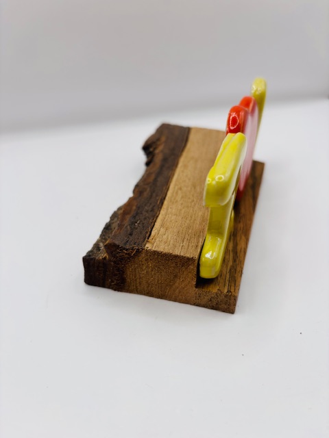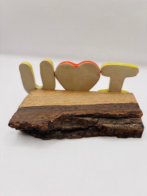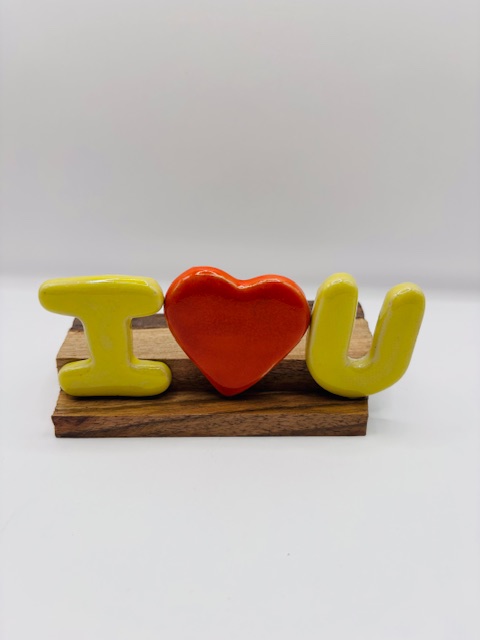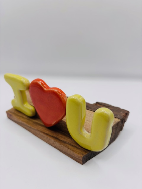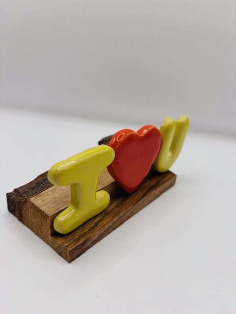 Lettres et coeur en céramique émaillée. Coloris rouge et jaune.